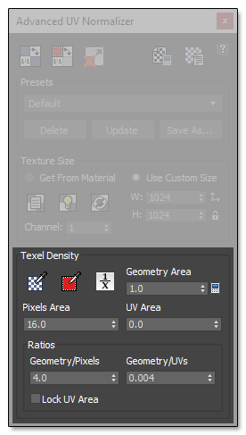 This will set the Geometry Area to 1.0 and change the Pixels Area to keep the same Ratio. It is useful if you get the Texel Density from an object and want to know the amount of pixels used per Geometry Unit.