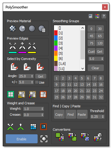 To start working with PolySmoother, select a node. If it is a supported node, the "Enable" button will be enabled and you can start previewing and working with the Smoothing Groups.