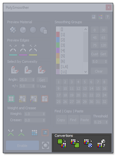 Transfers the smoothing Groups to a new Edit Poly Modifier.