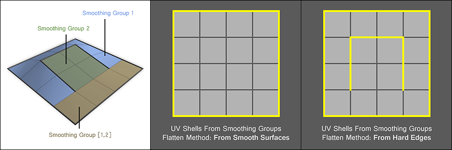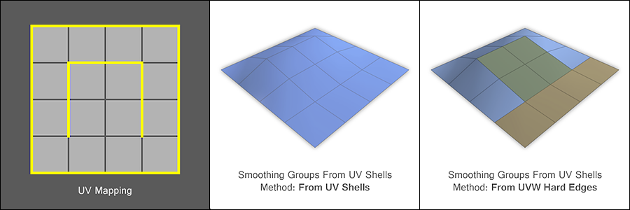 UVW Shells: Creates Smoothing Groups treating the UVW Shell as a whole surface regardless of the inner seams.