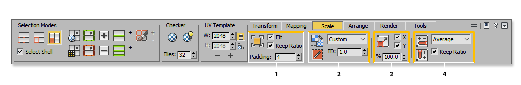 Rescale the selected Shells to have the same texel density. If there is no selection, all the Shells are selected.